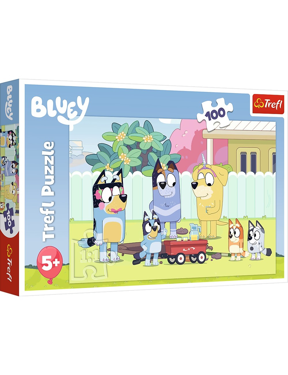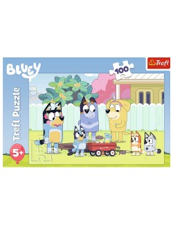 Puzzle Bluey Family, contine 100 de piese din carton, care formeza o imagine cu dimensiunile 41 x 28 cm, culori frumoase si vii.