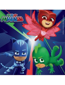 Set 20 servetele PJ Masks dimensiuni 33x33 cm (extins), din 2 straturi de hartie fina, imprimeu: Sopi, Pisoi si Bufnita, culori intense.