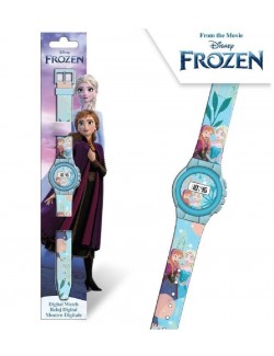 Ceas de mana Disney Frozen, digital, pentru copii, lungime totala 22 cm, diametru 3 cm, fabricat din plastic, culoare bleu.