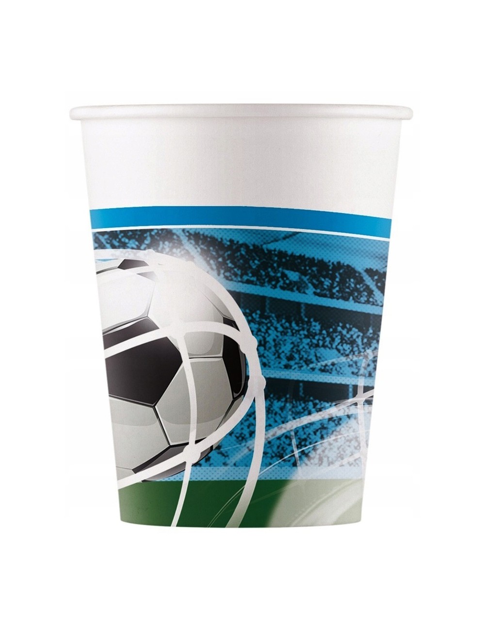 Set 8 pahare Fotbal Party, de unica folosinta, capacitate 200 ml. din carton, multicolore, imprimate cu mingi de fotbal in plasa portii.