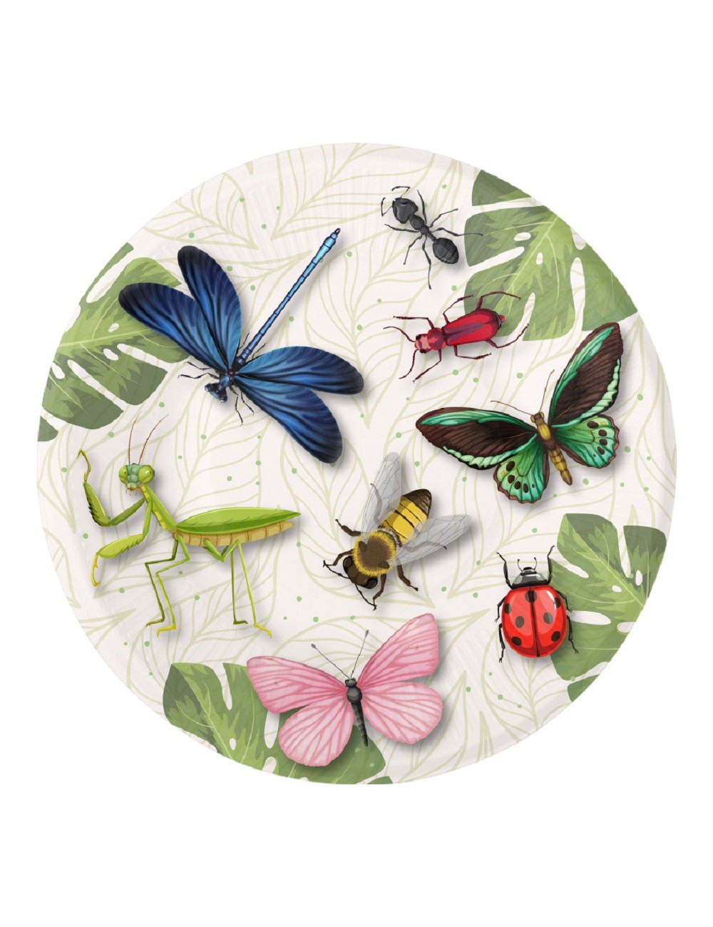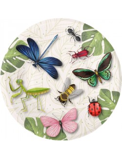 Set 8 farfurii Insecte colorate, diametru 23 cm, de unica folosinta, din carton, imprimeu multicolor cu fluturi, gargarita, albina, libelula, lacusta si alte gâze.