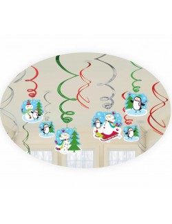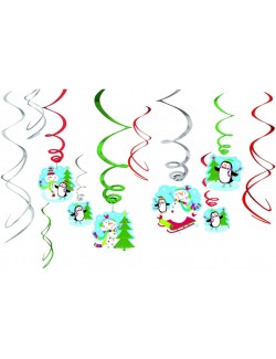 Set 12 decoratiuni suspendate pentru Craciun, contine 6 decoratiuni simple, din folie metalizata si 6 decoratiuni cu medalioane imprimate cu Oameni de zapada si Pinguini.