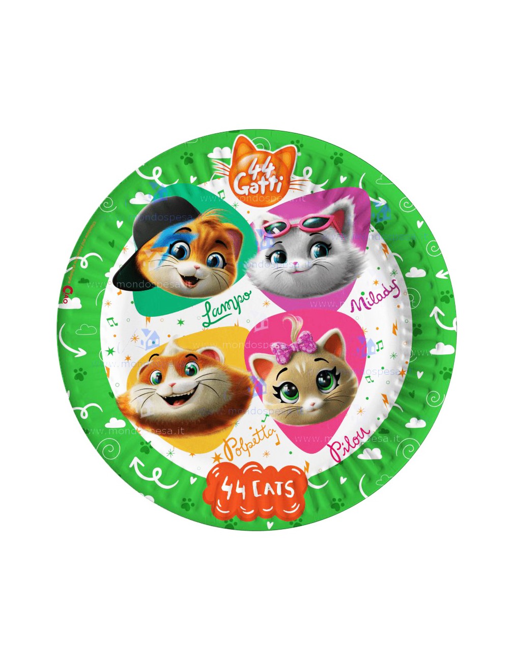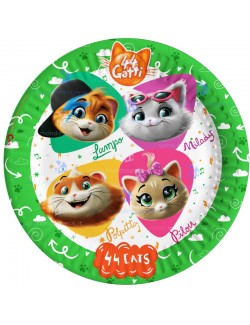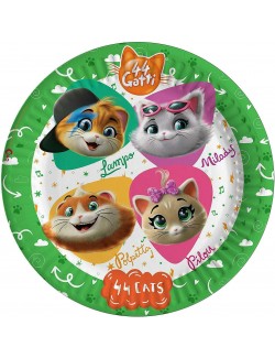 Set 8 farfurii Petrecere Pisici, diametru 23 cm, fabricate din carton, imprimate cu indragitii pisoi cantareti: Lampo, Milady, Pilou și Meatball.