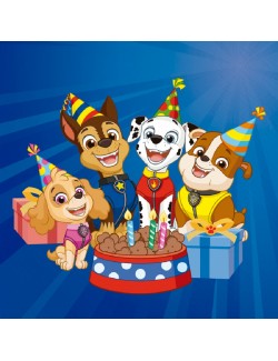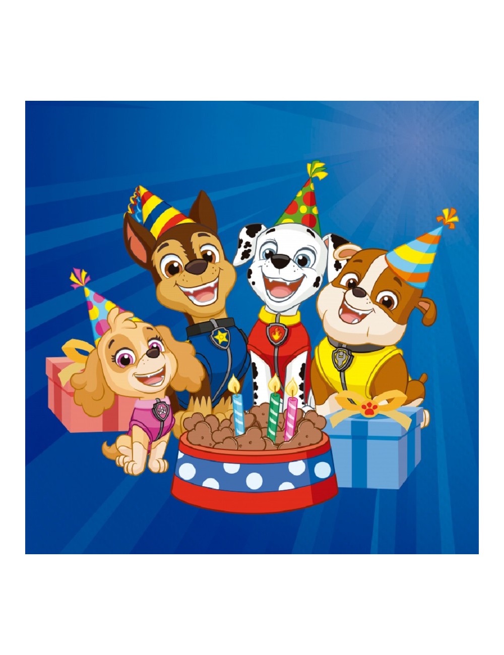 Set 20 servetele albastre, Paw patrol, dimensiuni 33 x 33 cm (extins), din 2 straturi de hartie fina, imprimate cu Skye, Chase, Rubble si Mashall.
