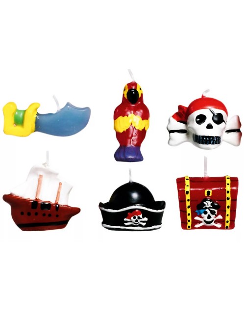 Set 6 lumanari tort, Pirati, dimensiuni 3-6 cm, contine 1 barcă, 1 sabie, 1 papagal, 1 pălărie de pirat, 1 craniu și 1 cufăr de comori. Ideal pentru decorarea mesei festive cu tema piratilor.