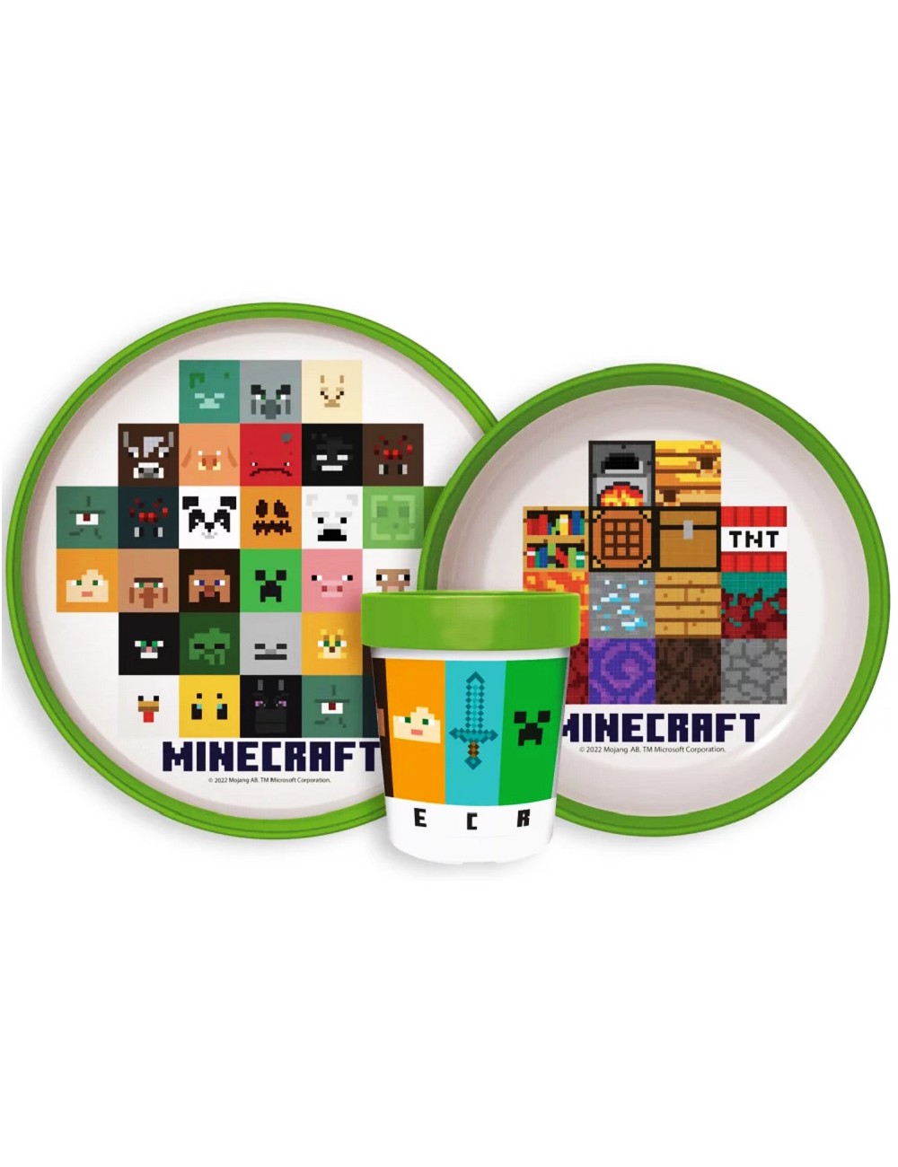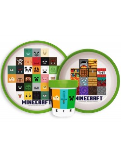 Set masa 3 piese Minecraft, din plastic cu baza antiderapanta, contine: o farfurie cu diametrul de 20 cm, un bol cu diametrul de 14 cm si un pahar de 260 ml.