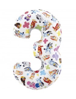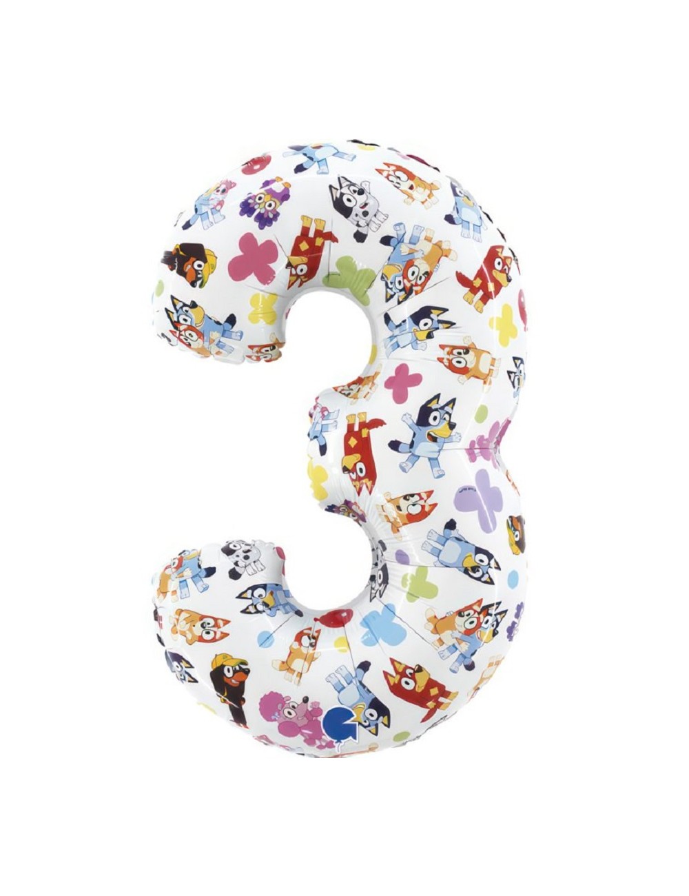 Balon folie, Cifra 3 Bluey Family, dimensiuni aprox. 55 x 95 cm (dezumflat), aprox. 45 x 75 cm dupa umflare, poate fi umplut cu heliu (pluteste) sau cu aer (nu pluteste).