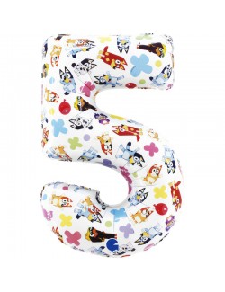 Balon folie Cifra 5 Bluey Family, dimensiuni aprox. 78 x 97 cm (dezumflat), aprox. 49 x 72 cm dupa umflare, poate fi umplut cu heliu (pluteste) sau cu aer (nu pluteste).
