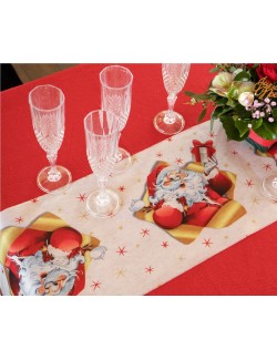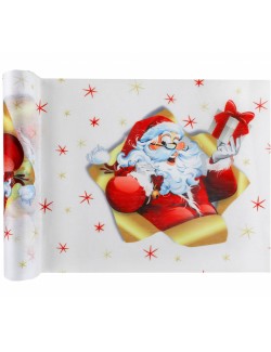 Rola decor masa Craciun, Santa Claus, lungime 500 cm, latime 30 cm, din material netesut-100% poliester, fond alb, imprimeu multicolor.