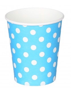 Set 6 pahare bleu cu buline albe, capacitate 220 ml, de unica folosinta, fabricate din carton.