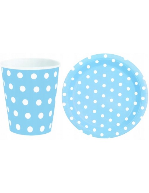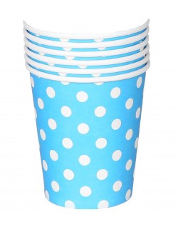 Set 6 pahare bleu cu buline albe, capacitate 220 ml, de unica folosinta, fabricate din carton, pentru petreceri de copii si adulti.