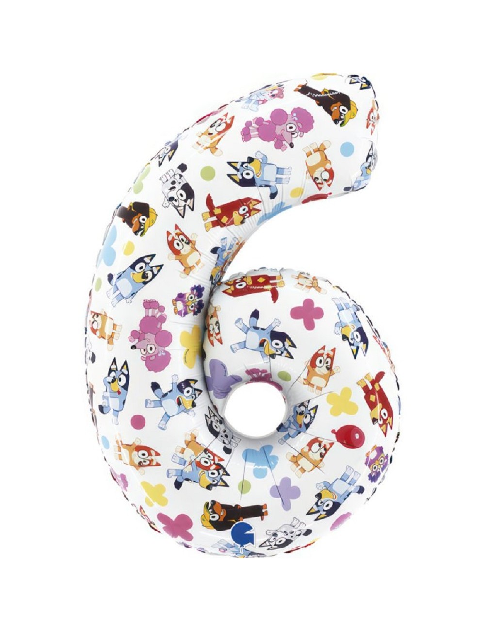Balon folie Cifra 6 Bluey Family, dimensiuni 70 x 92 cm (dezumflat), aprox. 49 x 72 cm dupa umflare, poate fi umplut cu heliu (pluteste) sau cu aer (nu pluteste).
