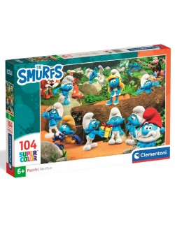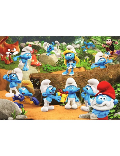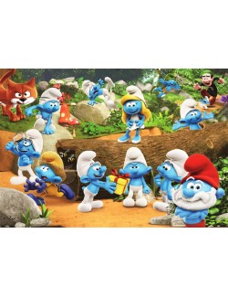 Puzzle Strumfi in padure, contine 104 de piese din carton, culori intense, care formeaza o imagine cu dimensiunile 38 x 27 cm, The Smurfs team.