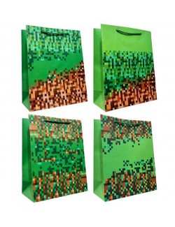 Punga pentru cadouri Pixels, 42 x 30 x 15 cm, din hartie verde, cu imprimeu inspirat de lumea pixelata Minecraft.