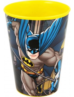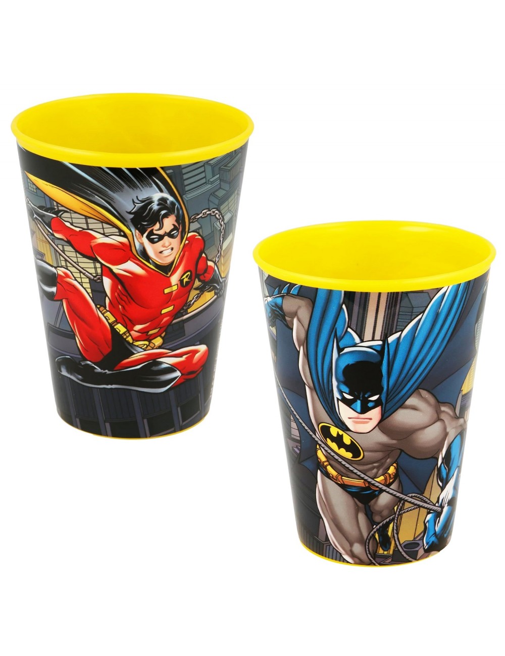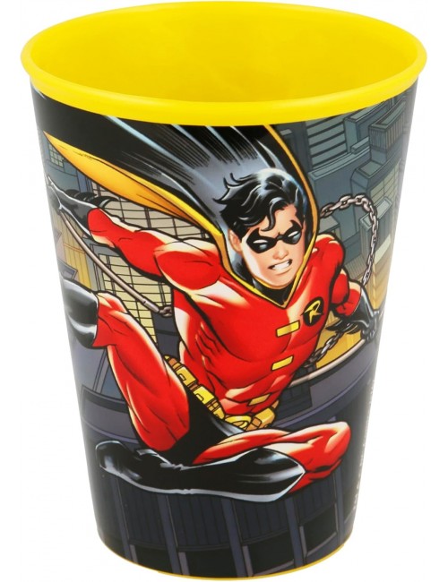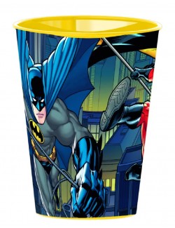 Pahar plastic, Batman & Robin, 260 ml, culoare galbena la interior, imprimeu multicolor, inaltime 10 cm.