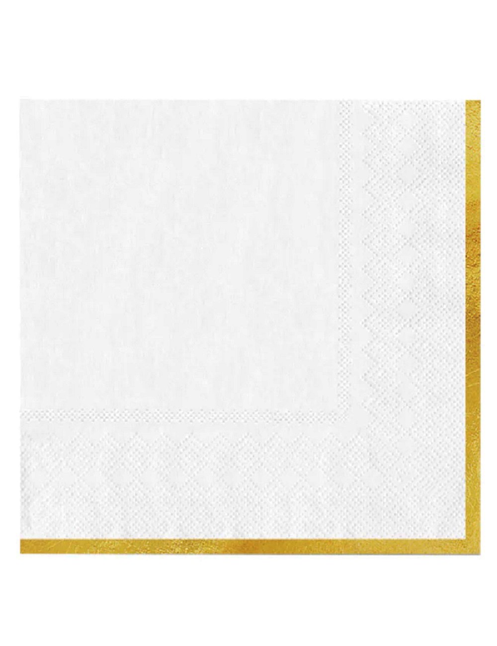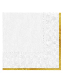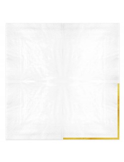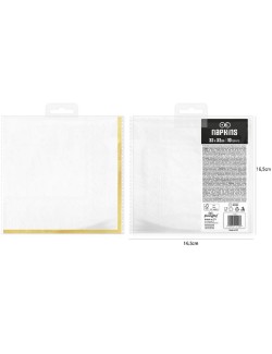 Set 10 servetele albe, dimensiuni 33 x 33 cm (extins), din 3 straturi de hartie fina, cu garnitura aurie pe o singura parte.