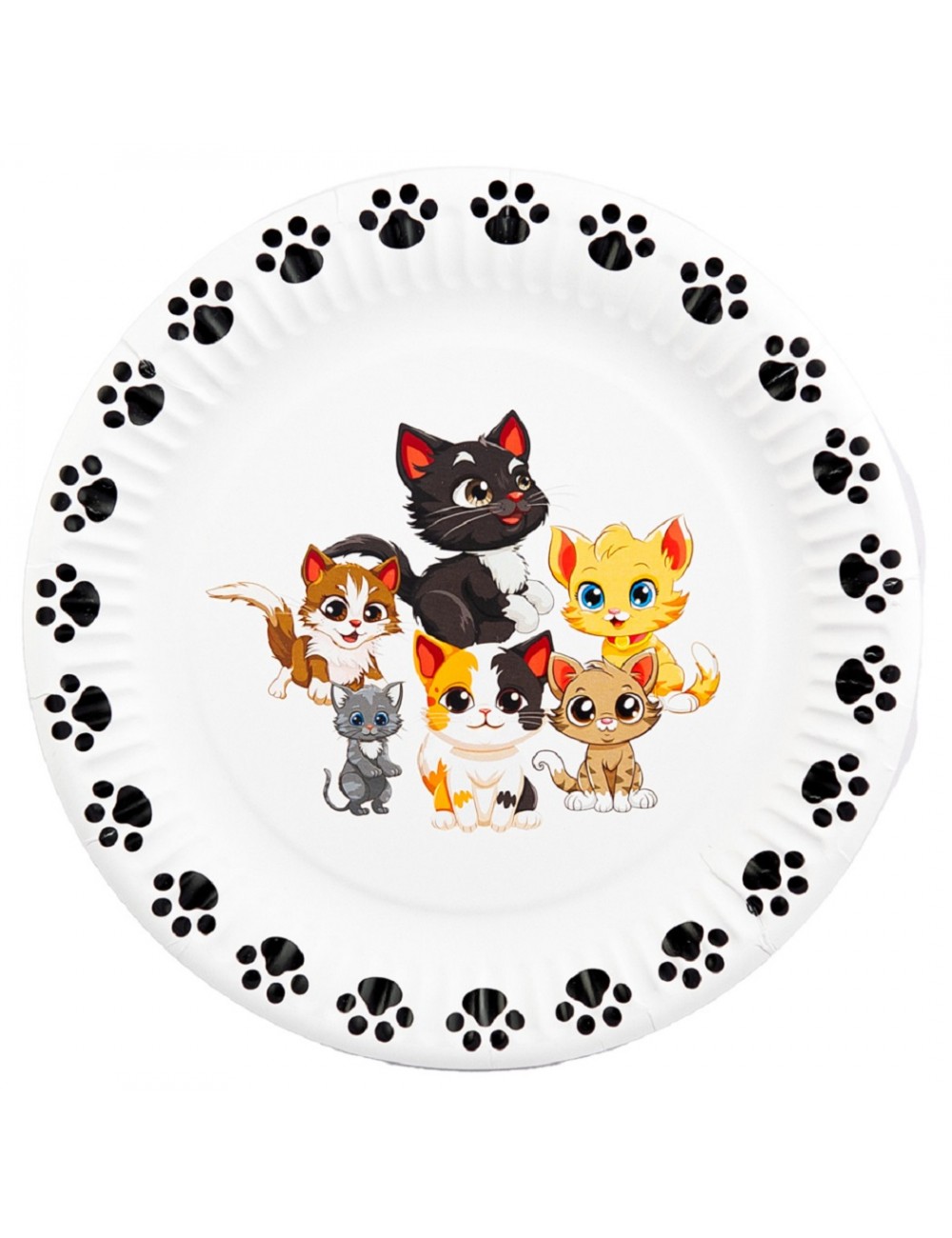 Set 6 farfurii, Party Pisicute, diametru 18 cm, de unica folosinta, culoare alba, imprimeu multicolor, fabricate din carton.