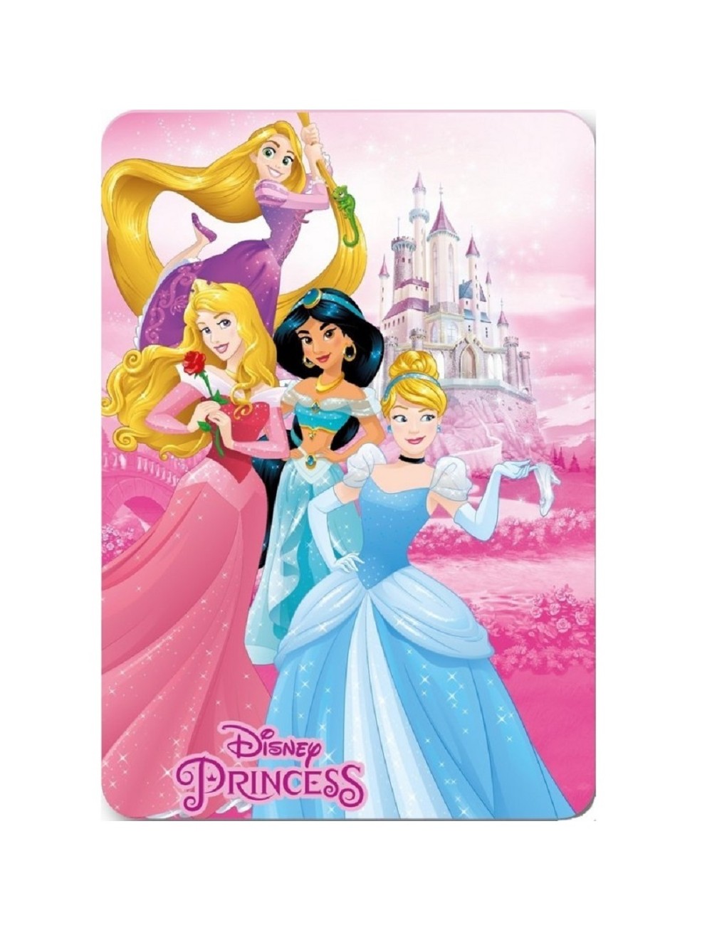 Paturica polar Printese Disney: Rapunzel, Jasmine, Aurora si Cenusareasa, dimensiuni 100 x 140 cm, material moale, 100% poliester, 220 gr/m2, cu protecție anti-scămosare.