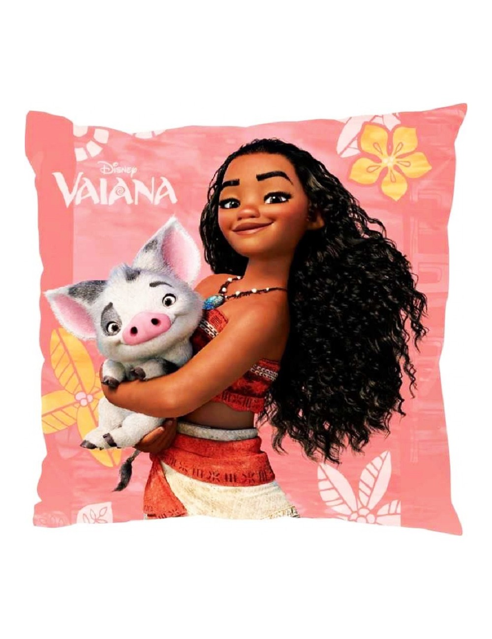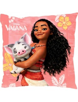 Perna decor Disney Vaiana, roz, dimeniuni 40 x 40 cm, imprimeu pe o singura parte cu Vaiana si Pua, poliester 100%.