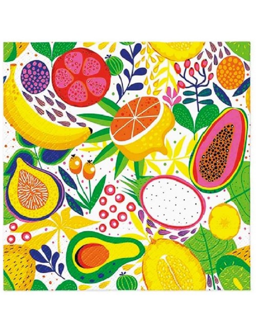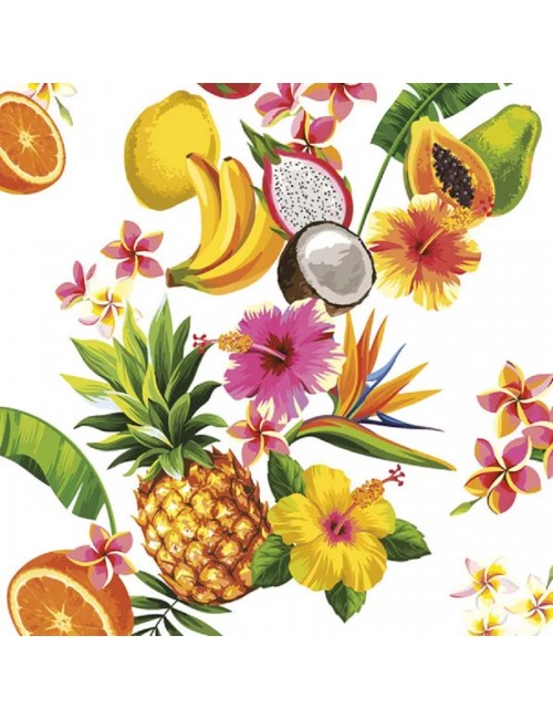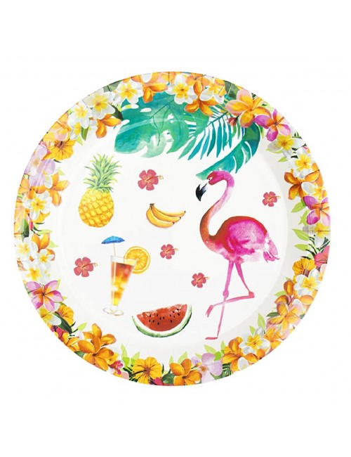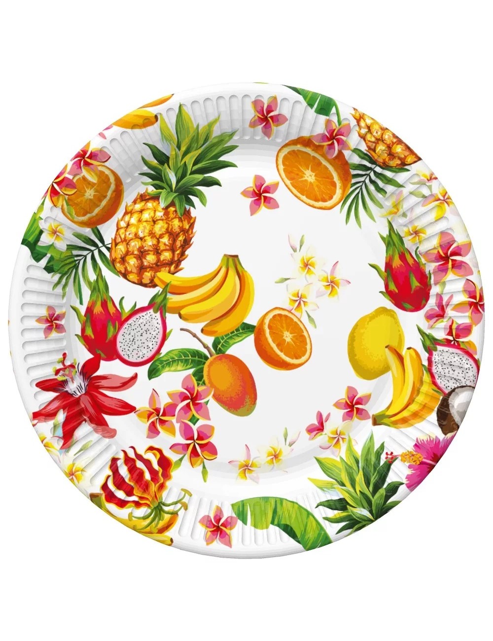 Set 8 farfurii Mix Tropical Fruits, diametru 23 cm, de unica folosinta, fabricate din carton, imprimeu multicolor cu fructe si flori.