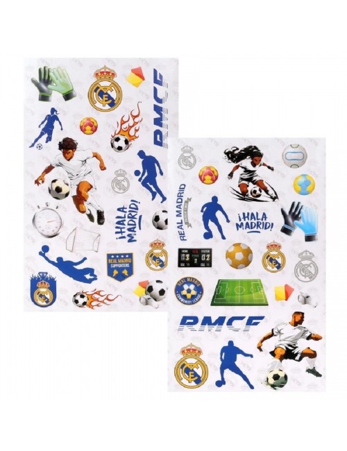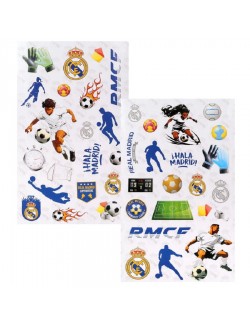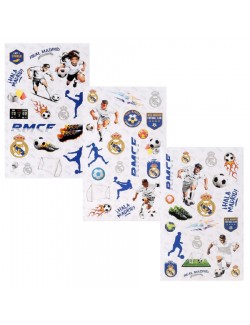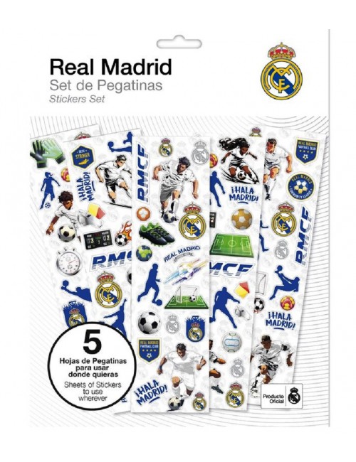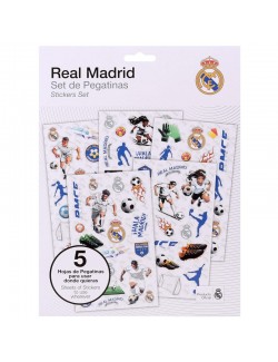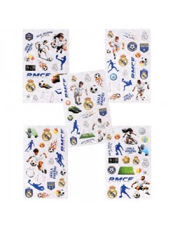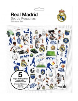 Set 5 planse cu stickere Real Madrid, contine autocolante cu modele dinamice care înfățișează logo-ul clubului, jucătorii, mingile și alte elemente legate de Real Madrid.