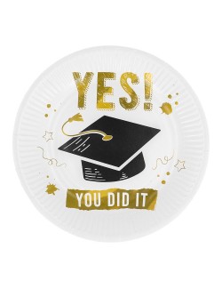 Set 8 farfurii Absolvire, Yes! you did it, diametru 23 cm, de unica folosinta, din carton, fond alb, imprimate cu o toca neagra si scris auriu.