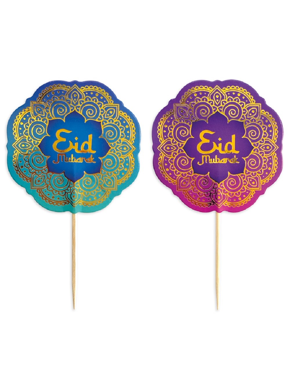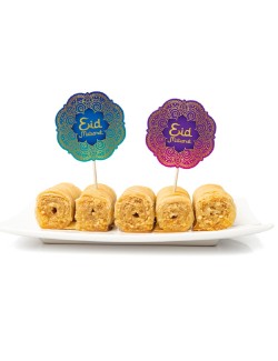 Set 12 Scobitori decorative, Eid Mubarak, din lemn si decoratiuni din hartie, adaugă o notă de eleganță meselor festive de la sfarsitul Ramadanului sau alte ocazii speciale.