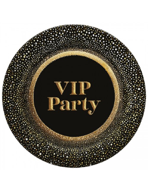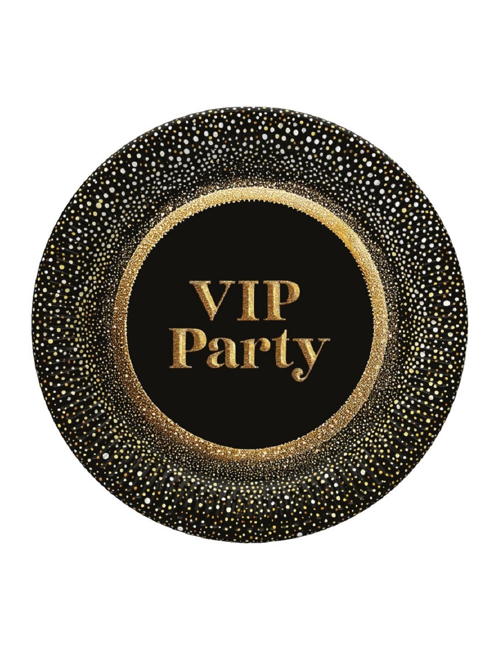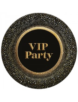 Set 8 farfurii desert, Party gold VIP, diametru 18 cm, de unica folosinta, din carton, culori negru-auriu, pentru petreceri elegante.