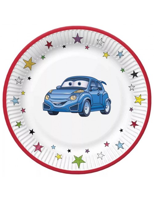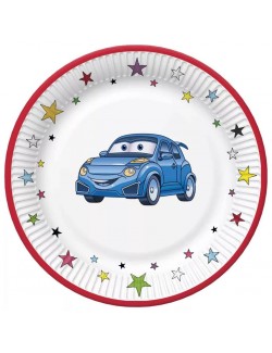Set 8 farfurii Masinuta albastra, diametru 18 cm, fabricate din carton, de unica folosinta.