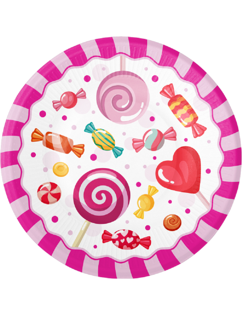 Set 8 farfurii Candy Party Lollipop, diametru 23 cm, de unica folosinta, din carton, culori alb-roz.