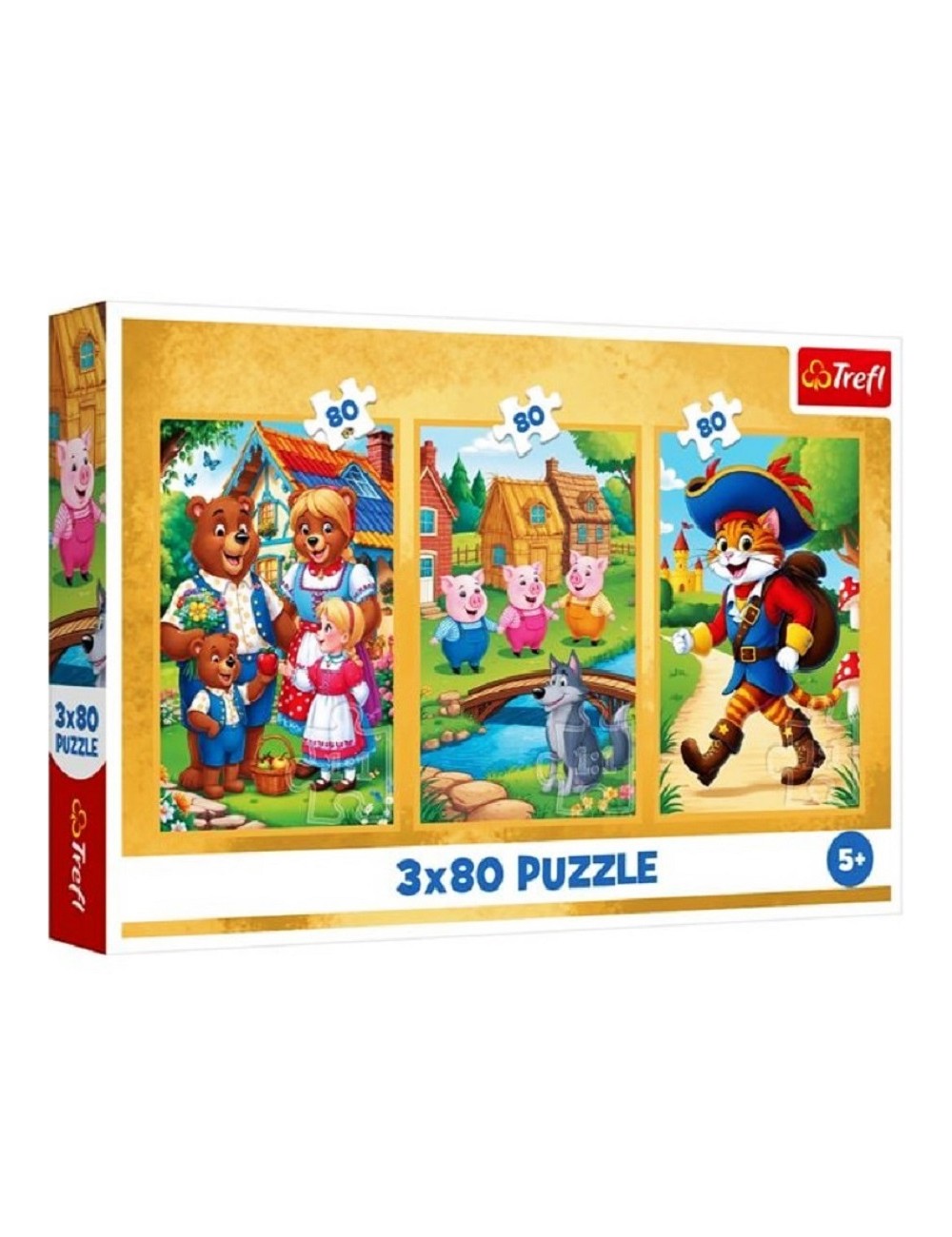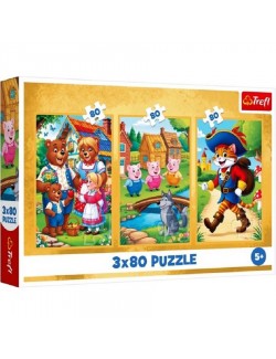 Puzzle 3 in 1 Povesti clasice - Fetita cu parul de aur, Cei 3 purcelusi si Motanul incaltat, contine 3 seturi cu cate 80 de piese din carton colorat, care formeaza 3 imagini cu dimensiunile 27,5 x 18 cm.