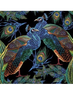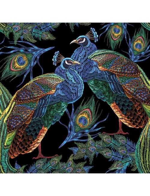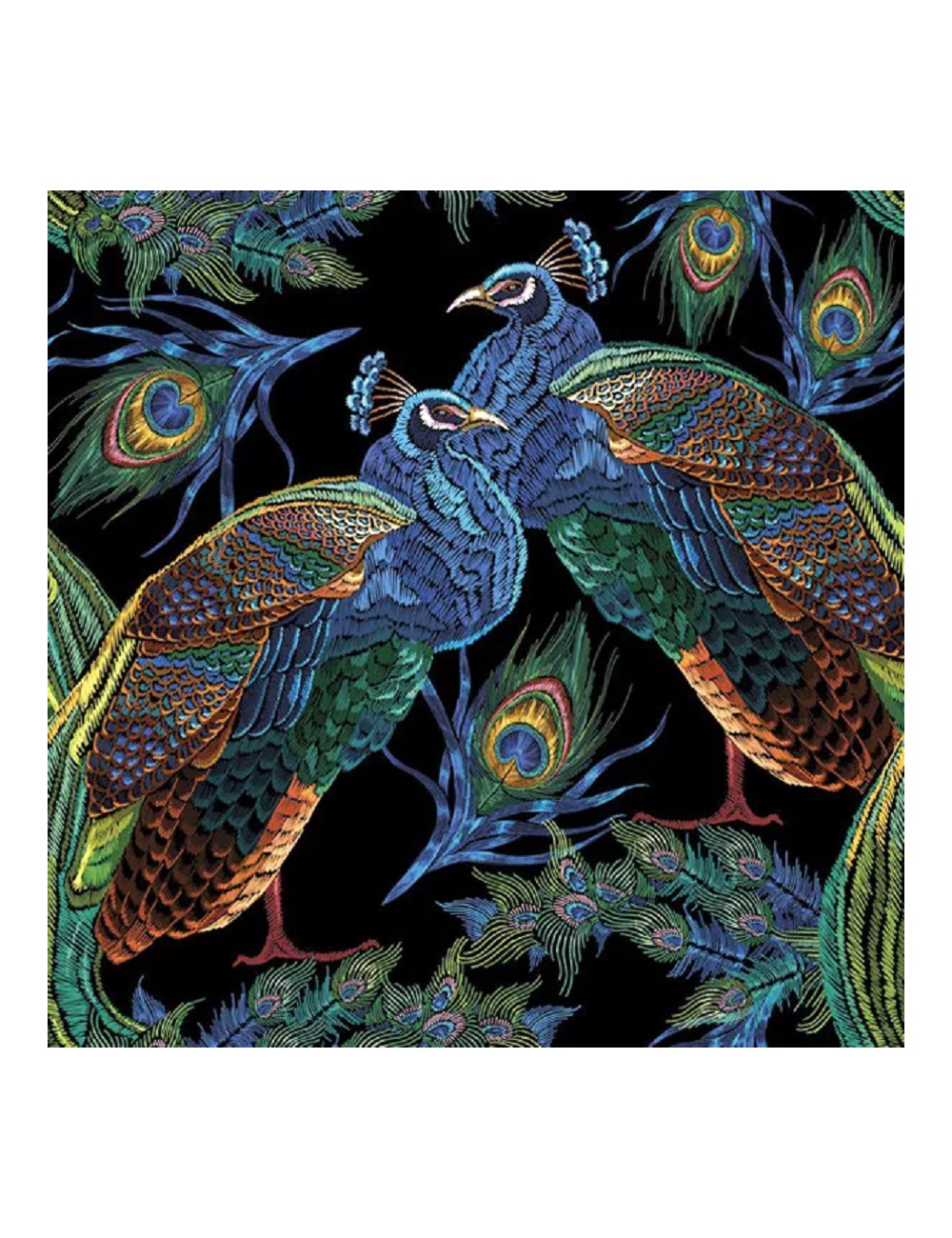 Set 20 servetele Pauni, dimensiuni 33 x 33 cm (extins), din 3 straturi de hartie, fond negru, imprimeu care imita o broderie, multicolor.