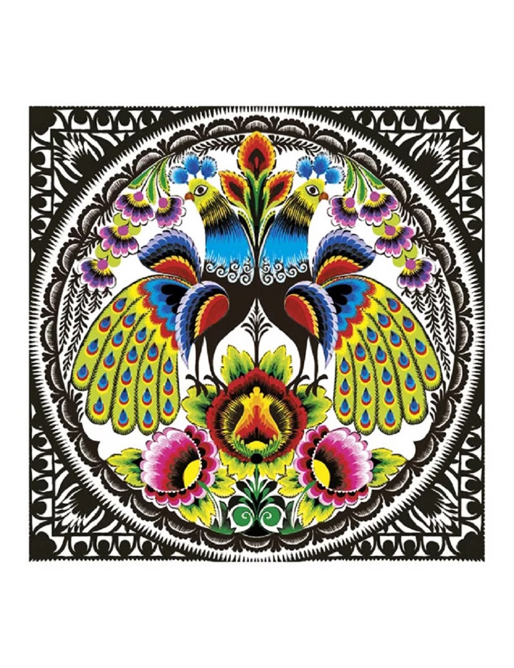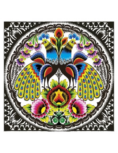 Set 20 servetele Folk Peacocks, dimensiuni 33 x 33 cm (extins), din 3 straturi de hartie, fond alb, imprimeu multicolor.