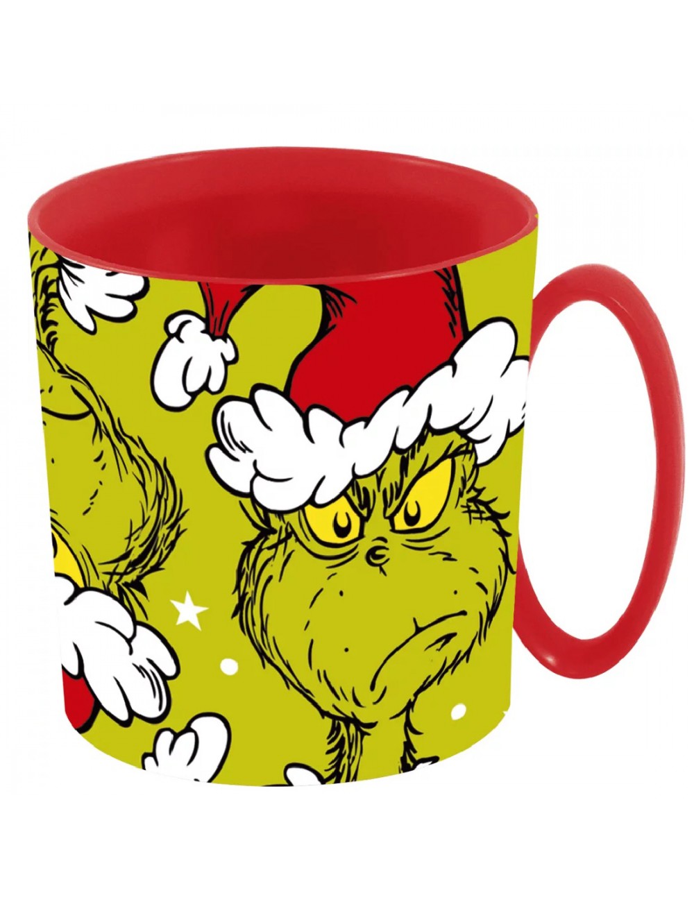Cana plastic The Grinch, culori rosu-verde, capacitate 350 ml, nu contine BPA, inălțime 9 cm, diametru 8 cm.