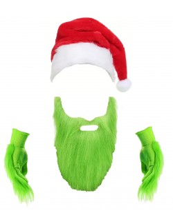 Set Caciula, barba si manusi Grinch, Christmas hater, culori verde, rosu, alb, material 100% poliester.
