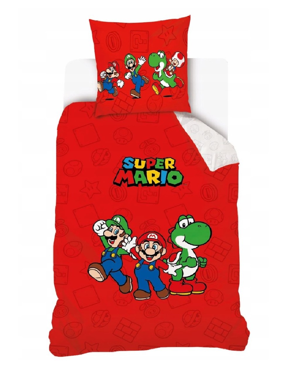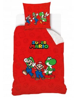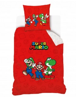 Lenjerie de pat Super Mario, culoare rosie, bumbac 100%, alcatuita din 2 piese: