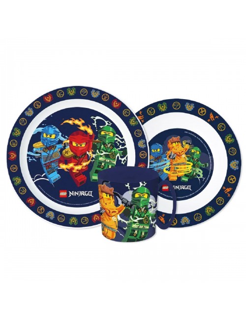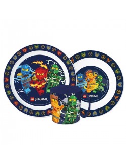 Set masa Lego Ninjago cu cana, din plastic, contine: o farfurie cu diametrul de 22 cm, un bol de 16 cm si o cana de 390 ml.