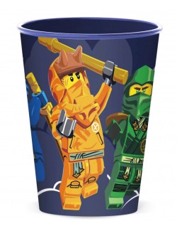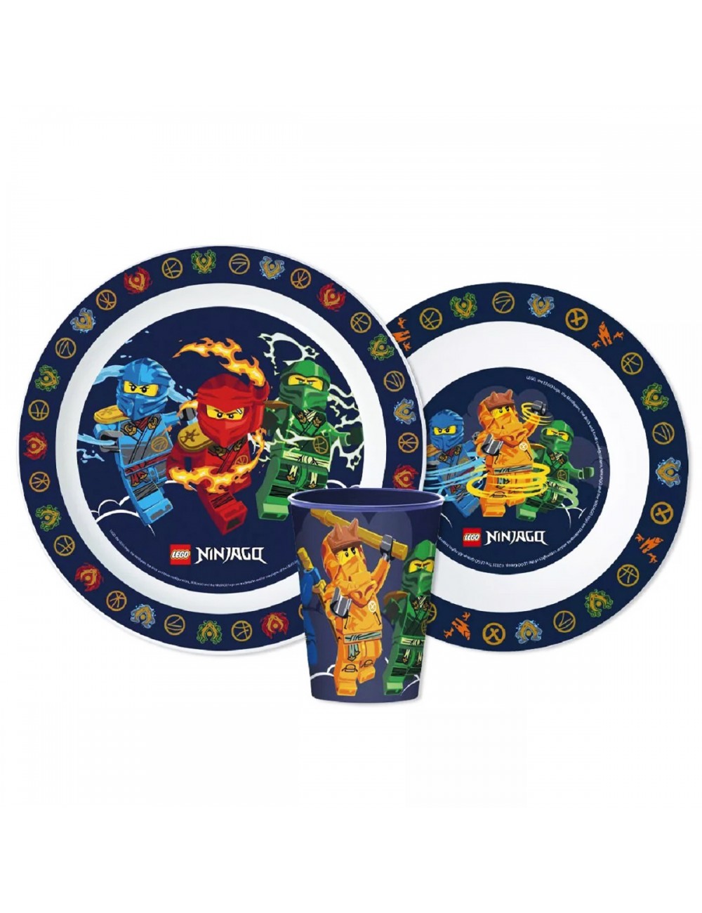 Set masa Lego Ninjago cu pahar, din plastic, contine: o farfurie cu diametrul de 22 cm, un bol cu diametrul de 16 cm si un pahar de 260 ml.
