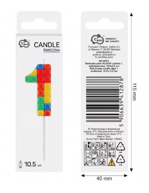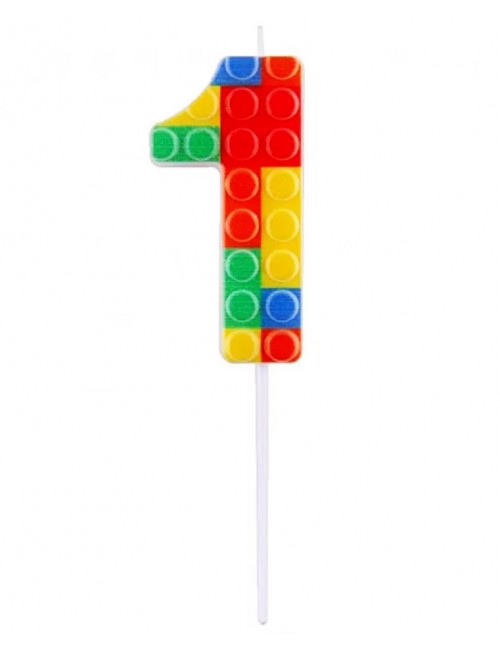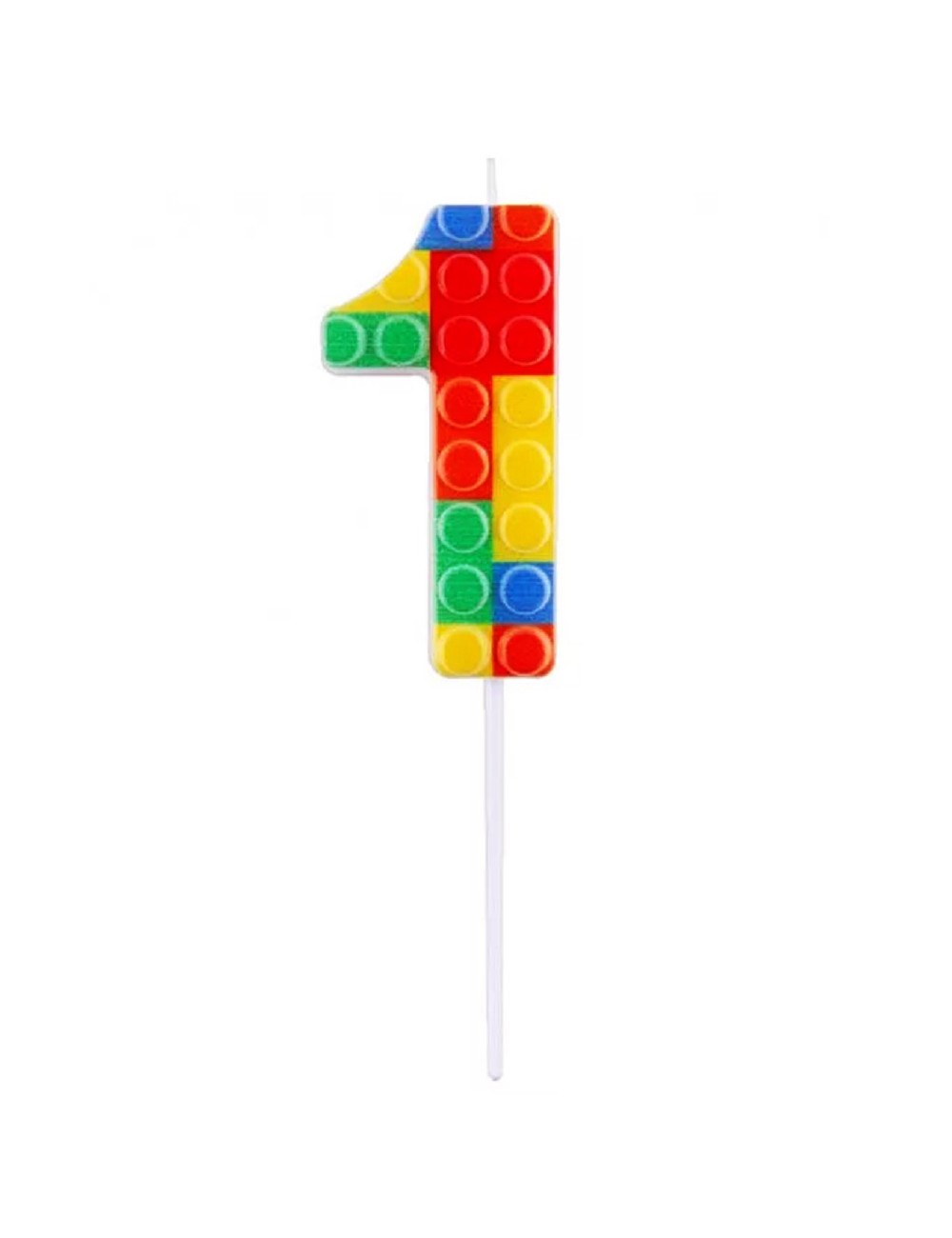 Lumanare tort, Cifra 1 Bricks, dimensiuni 6 x 3,5 cm, din parafina, este fixata pe un suport din plastic, inaltime totala 10,5 cm.