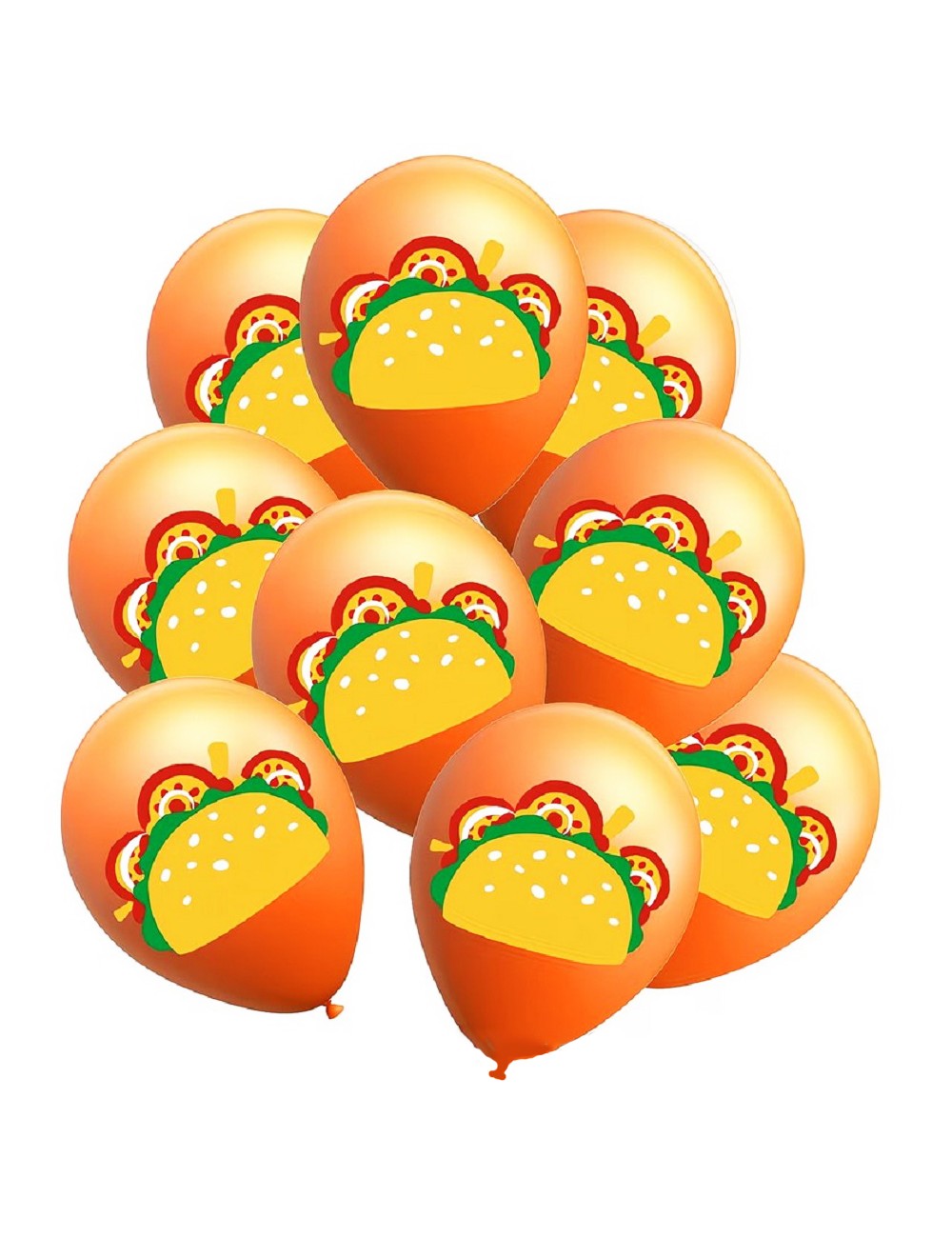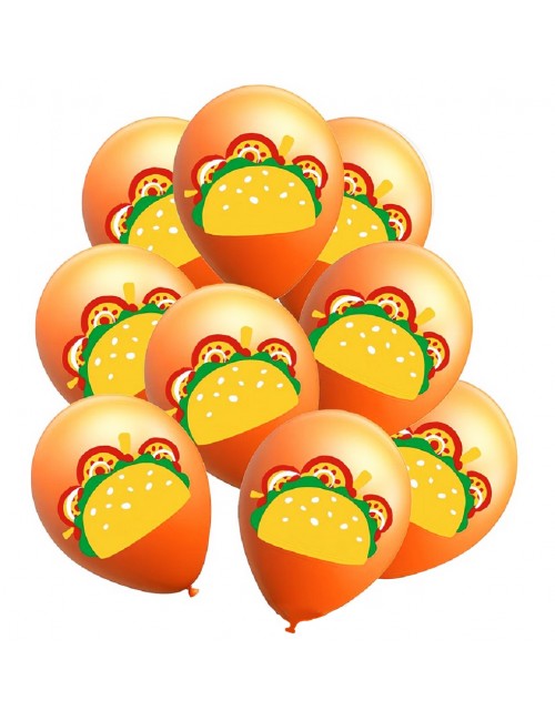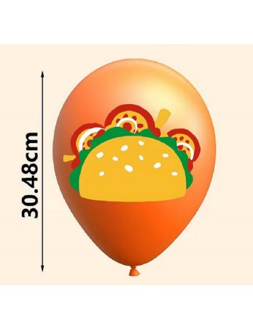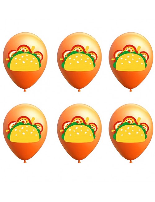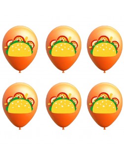 Set 6 baloane Taco Mexican party, 30 cm, din latex portocaliu si imprimeu cu un taco multicolor.