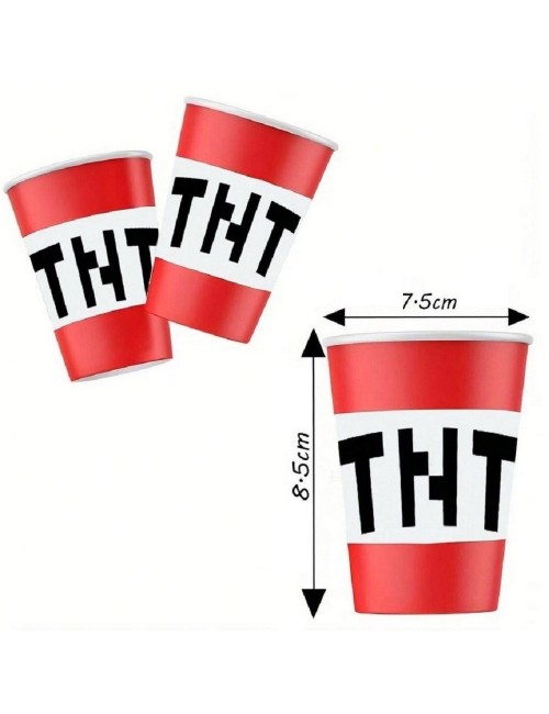Set 8 pahare Creeper-TNT, 250 ml, din carton, de unica folosinta, culori verde (4 buc) si rosu (4 buc), perfecte pentru petreceri cu tematica Minecraft.