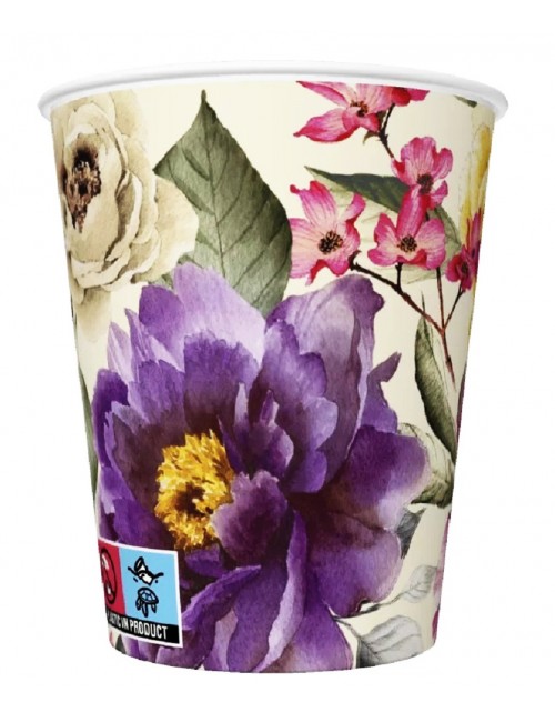 Set 8 pahare cu Bujori, capacitate 250 ml, din carton, de unica folosinta, fond crem si imprimeu multicolor.
