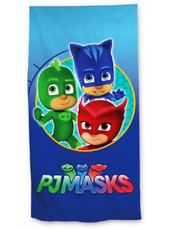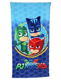 Prosop plaja PJ Masks It's time to be a Hero!, 70 x 140 cm, bumbac 100%, fond albastru cu imprimeu multicolor, cu indragitii Eroi in pijamale: Sopi, Bufnita si Pisoi.