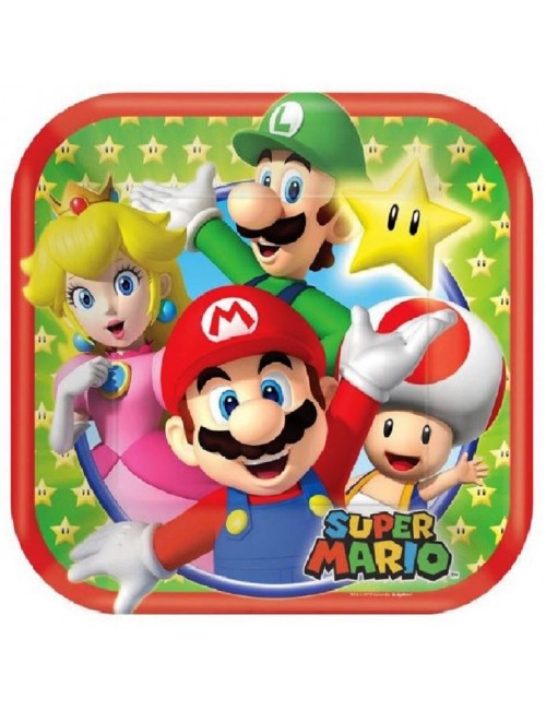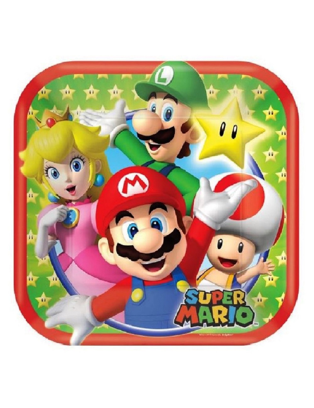 Set 8 farfurii petrecere, Mario Bros, de unica folosinta, fabricate din carton, forma patrata, cu latura de 18 cm.