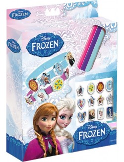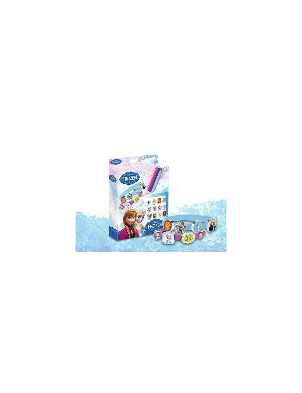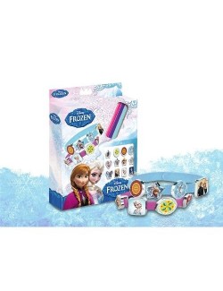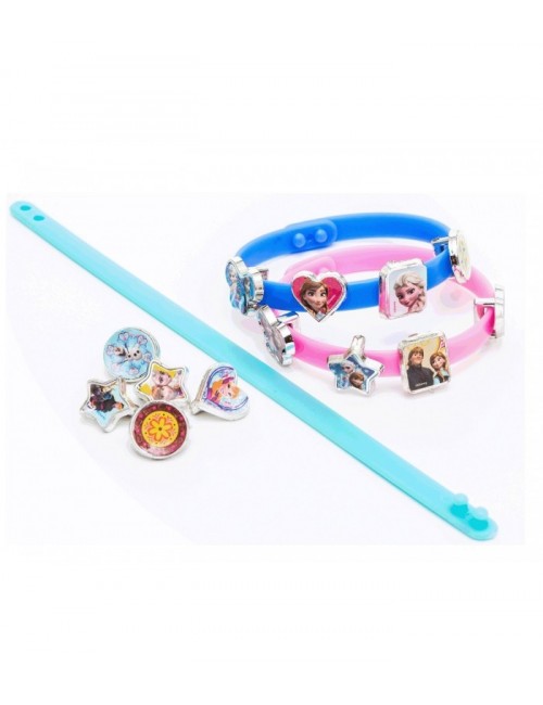 Setul contine 3 bratari de culori diferite si 18 mici medalioane care se ataseaza, dupa preferinta fiecarei fetite, pe fiecare dintre cele 3 bratari, sunt confectionate din material plastic si au imprimate personajele din Regatul de Gheata. Dimensiune cutie: 15*18*2.5 cm.