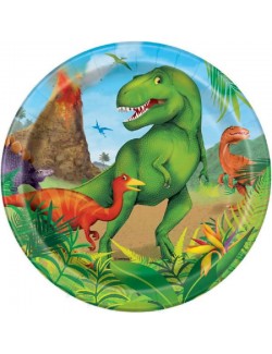 Set 8 farfurii Dinozauri, de unica folosinta, fabricate din carton, diametru 17 cm, imprimate cu mai multe specii de dinozauri intr-un peisaj preistoric.