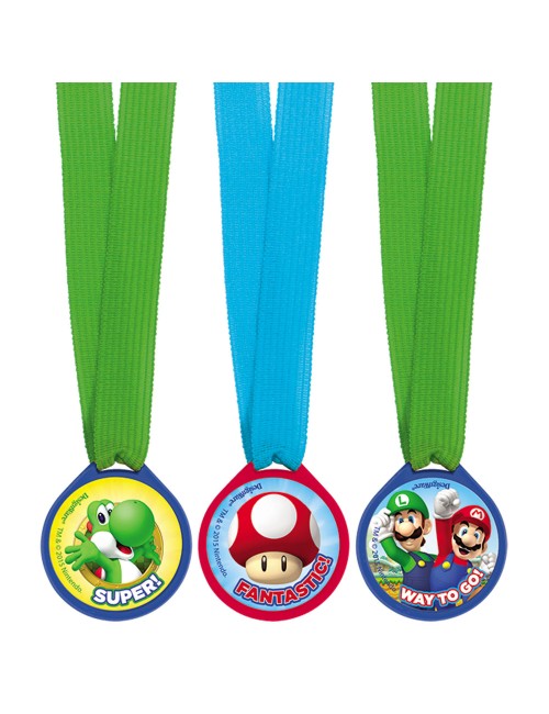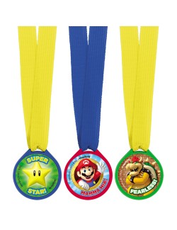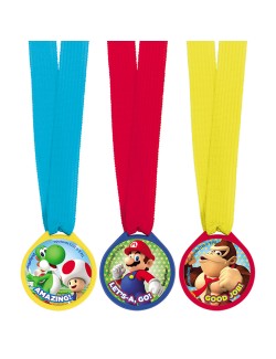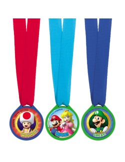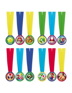 Set 12 Medalii Party Super Mario, din plastic si material textil, multicolore, inscriptionate cu numele si figurile personajelor indragitului joc.