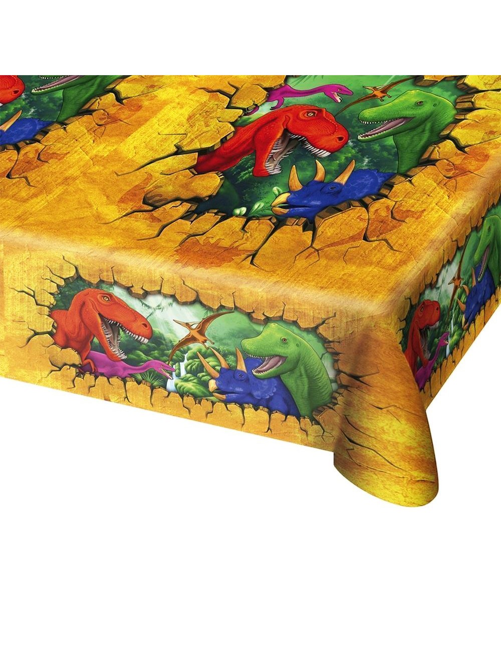 Fata de masa Dinozauri, 130 x 180 cm, fabricata din PVC, imprimeu multicolor cu diverse specii de dinozauri.