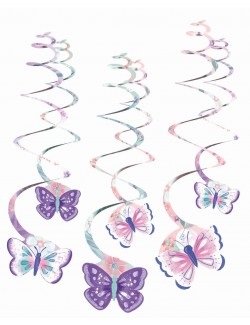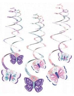 Set 6 decoratiuni suspendate, Fluturi, dimensiuni 14x10 cm, multicolore, din carton, cu lungime totala de 61 cm.