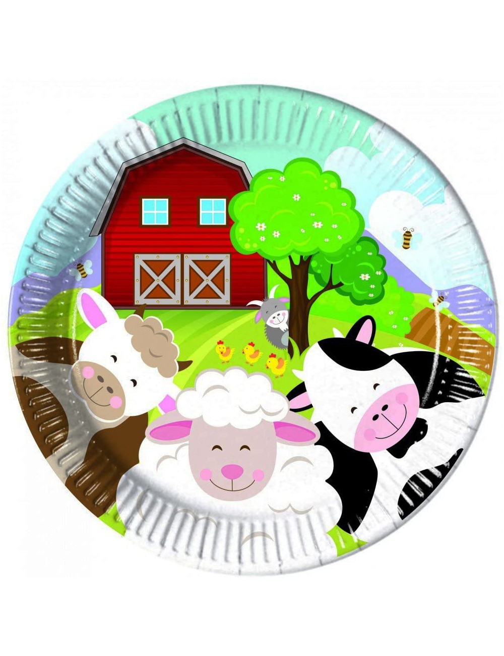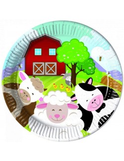 Set 8 farfurii Ferma, pentru petrecere, fabricate din carton, diametru 23 cm, imprimate cu mai multe animalute domestice.